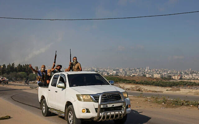 Hamas-terroristen rukken op naar de Erez-grensovergang tussen Israël en de noordelijke Gazastrook tijdens de aanval van de terreurgroep op 7 oktober 2023. Foto AFP